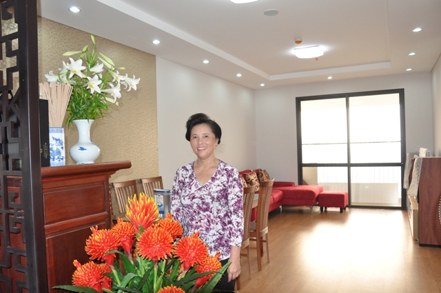 Cô Lê Thị Quỳnh, một trong những cư dân đầu tiên về sinh sống tại tòa nhà phấn khởi trong căn hộ mới của mình
